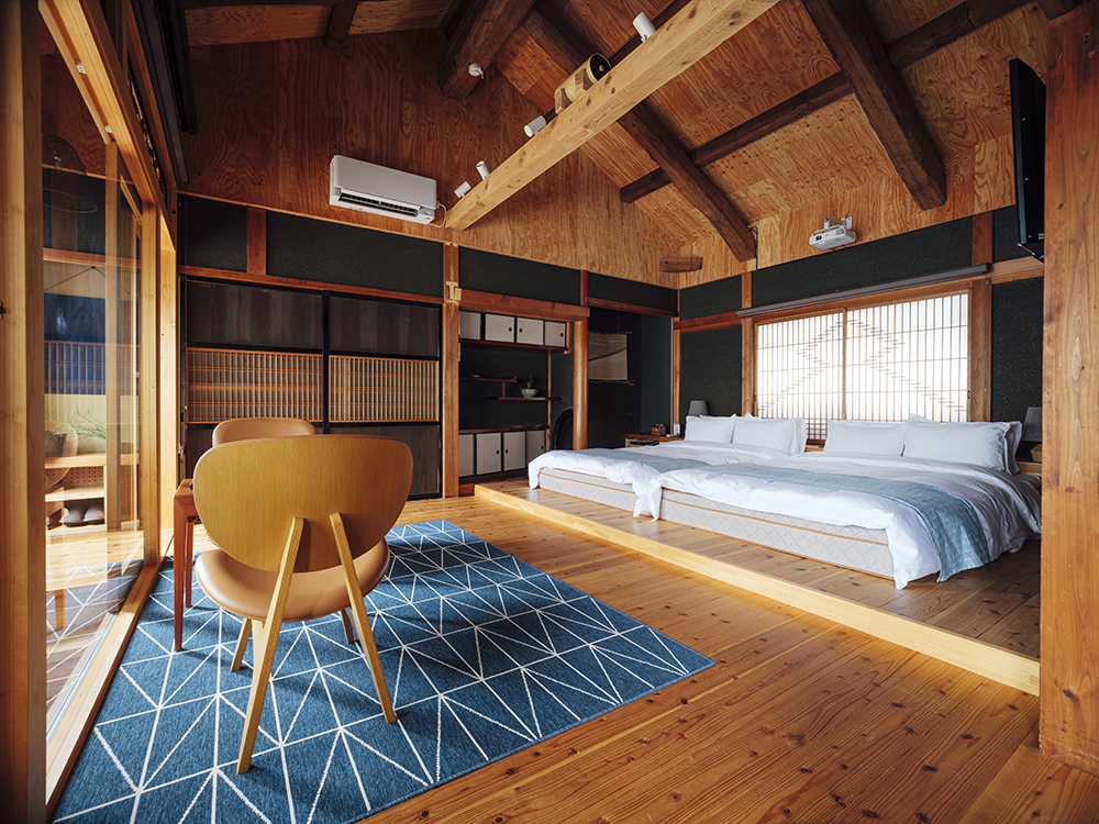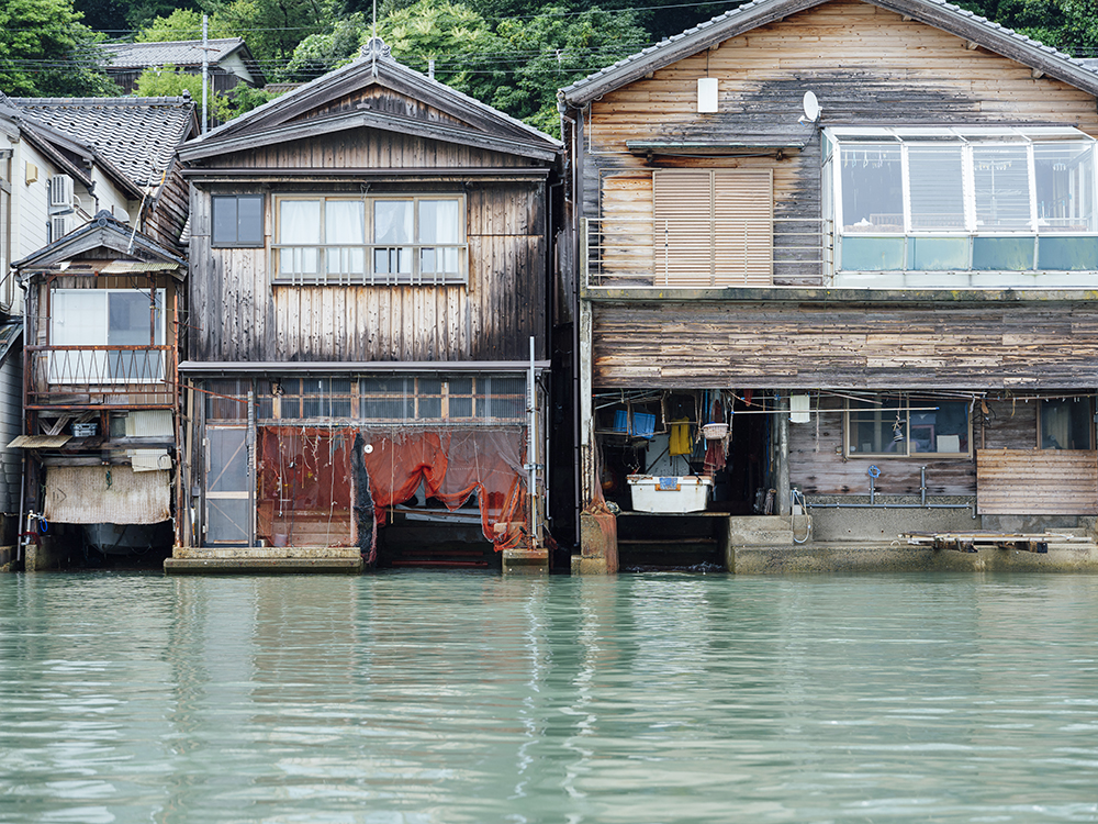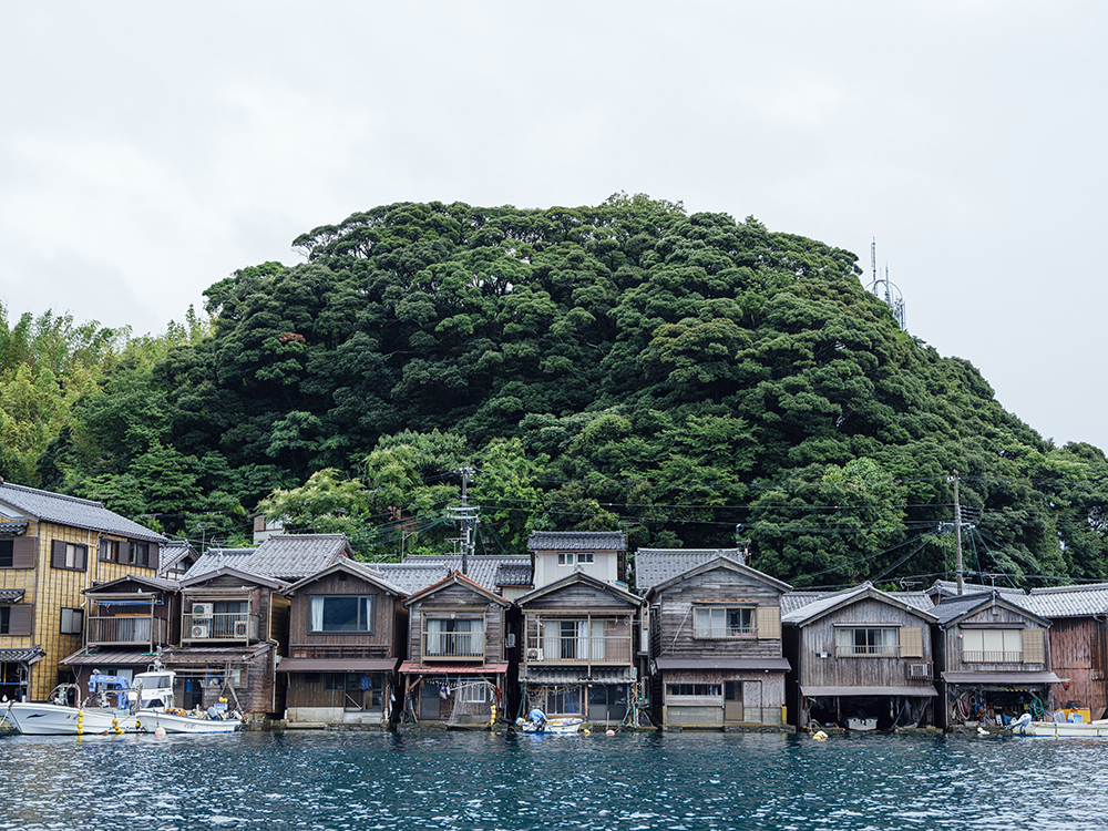 Aoshima, “the island of God,” fl oats in the bay with a gentle curve that seems to embrace the sea with two arms. Because of this miraculous topography, the sea of Ine is endlessly calm. At some point, fishermen began to live on the waterfront, opening up the limited flat land. And in the Edo period, boathouses began to line along the bay as garages (barns), which is the prototype of Ine’s boathouses, today.