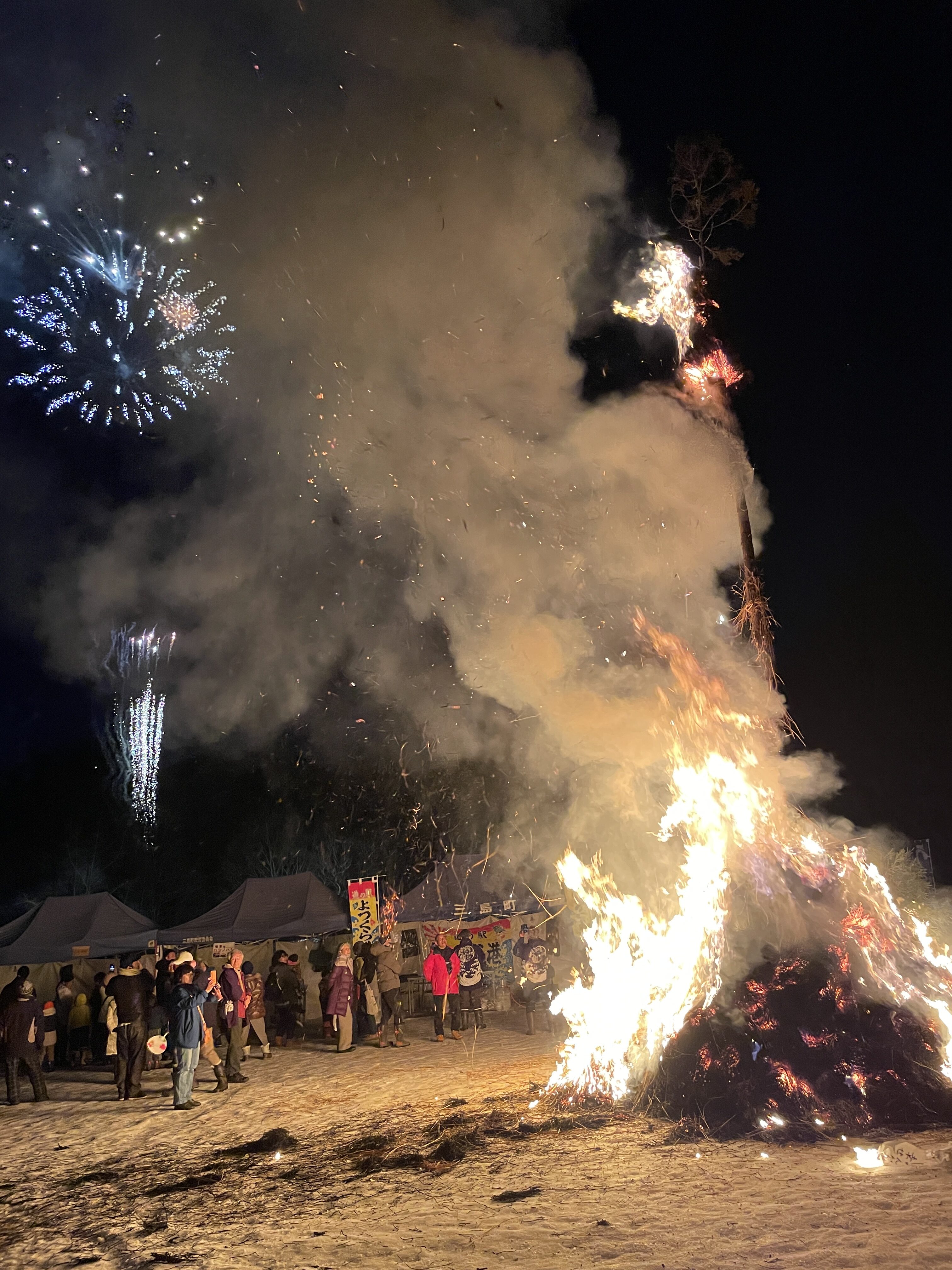 日が暮れた後、サイノカミの点火式では桐の紋章の半被を羽織った矢澤町長ほか数人が松明で御神木に点火すると、火が炎となって天に上り出した。お正月飾りやお供えもの、子どもたちが書いた願い事も火のなかでどんどんシルエットに変わる。炎のなかから竹が弾け飛んでくる。村落に災いや疫病が入るのを防ぎ、無病息災と五穀豊穣を祈願する厄祓いだけに、この火にあたるだけで気持ちいい。やましい考えが、穢れが燃やされていく。