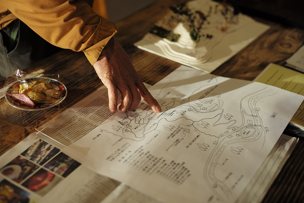 「道路も何もない森に、かつて叔父が住んでいた空き家が一軒あって。ここを遊び場兼事務所にしようと思った時に、集落一帯でこんなことがやりたいというイメージスケッチを描いたんです」