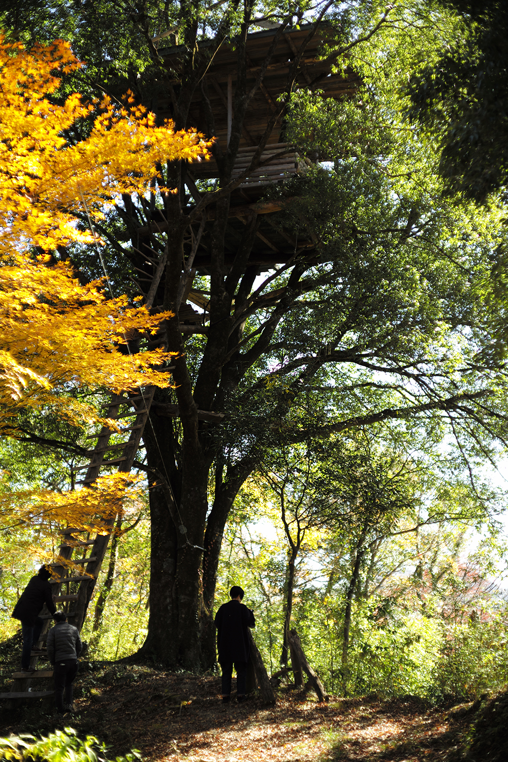 一日出さんのツリーハウスづくりは感覚こそが頼り。「何でも実験するんです。計算ほどあてにならんもんはない」と大きく笑って言いのける。子どもの頃から山で遊び尽くしてきた一日出さんの身体には、自然の感覚が染み付いているのだろう。設計図はなく、木の状態を見ながら即興でつくり上げていく。