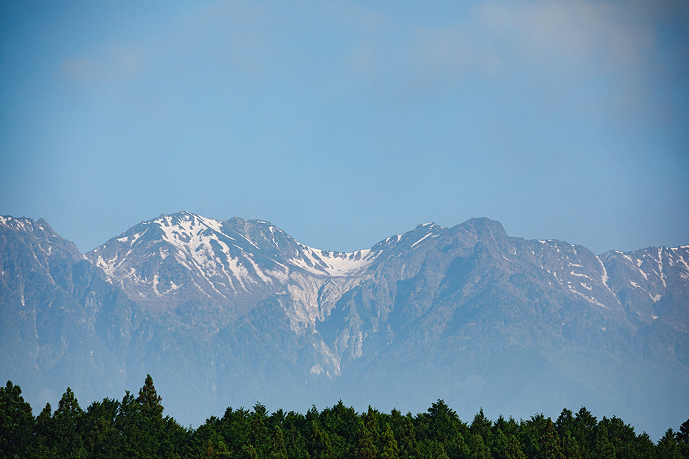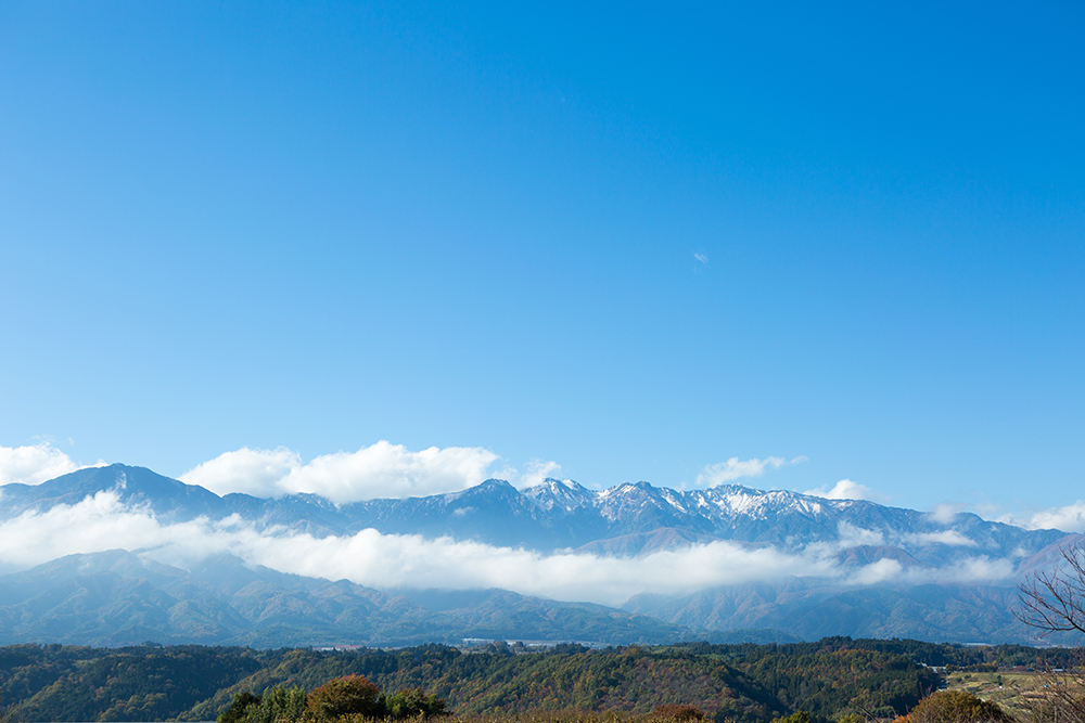 中央高速自動車道で諏訪湖を横目に見送り、ジャンクションのカーブを南へ。岡谷の山中を抜けたあたりから、景色がふいに変っていくことに気づく。いつの間にか右にも左にも、屏風のようにそびえ立つ2000〜3000メートル級のアルプス。けれどその光景に迫り来る緊張感はなく、ゆったりと裾野を広げた山々はむしろ、ほどよい間合いでこちらを見守っているようだ。